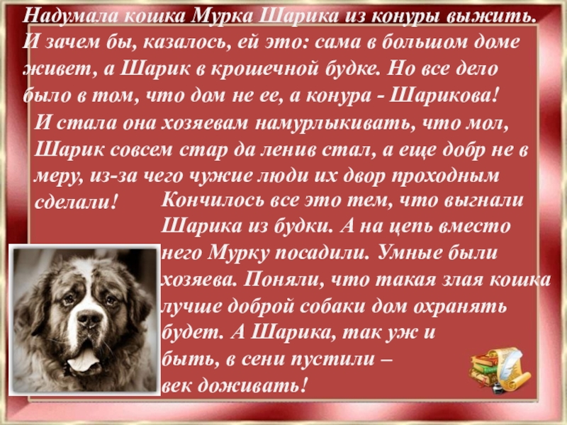 И стала она хозяевам намурлыкивать, что мол, Шарик совсем стар да ленив стал, а еще добр не в меру, из-за чего чужие люди их двор проходным сделали!