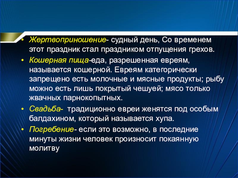 Кошерная пища-еда, разрешенная евреям, называется кошерной. Евреям категорически запрещено есть молочные и мясные продукты; рыбу можно есть лишь покрытый чешуей; мясо только жвачных парнокопытных.