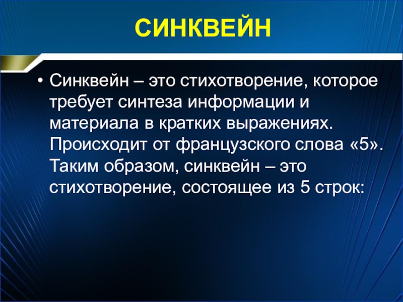 кратких выражениях. Происходит от французского слова «5». Таким образом, синквейн – это стихотворение, состоящее из 5 строк: