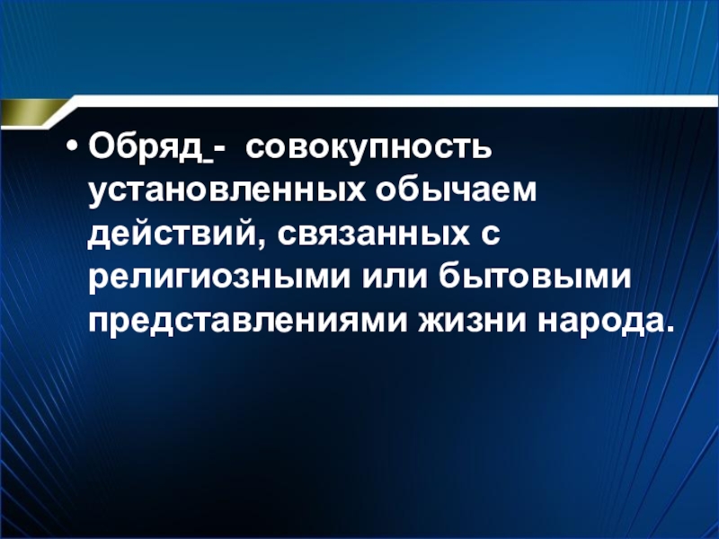 Обряд - совокупность установленных обычаем действий, связанных с религиозными или бытовыми представлениями