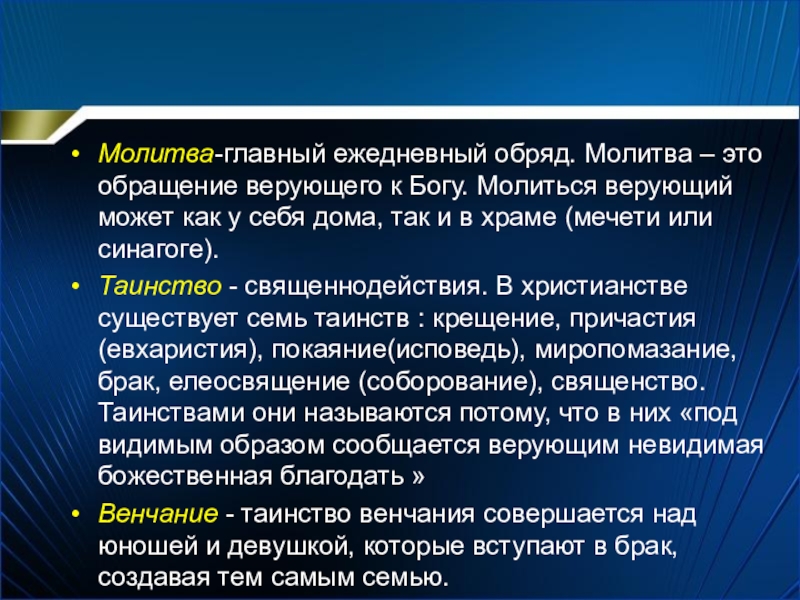 Молитва-главный ежедневный обряд. Молитва – это обращение верующего к Богу. Молиться