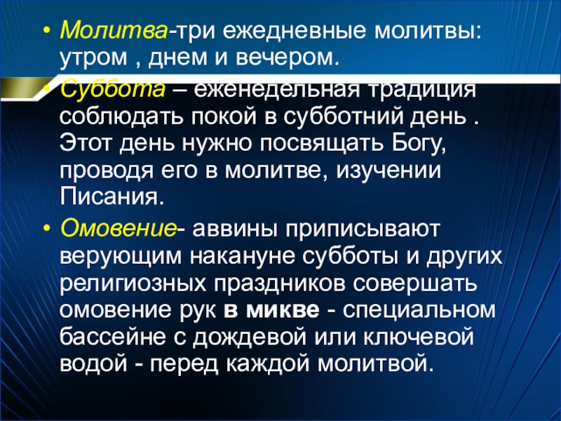Омовение- аввины приписывают верующим накануне субботы и других религиозных праздников совершать омовение рук в микве - специальном бассейне с дождевой или ключевой водой - перед каждой молитвой.