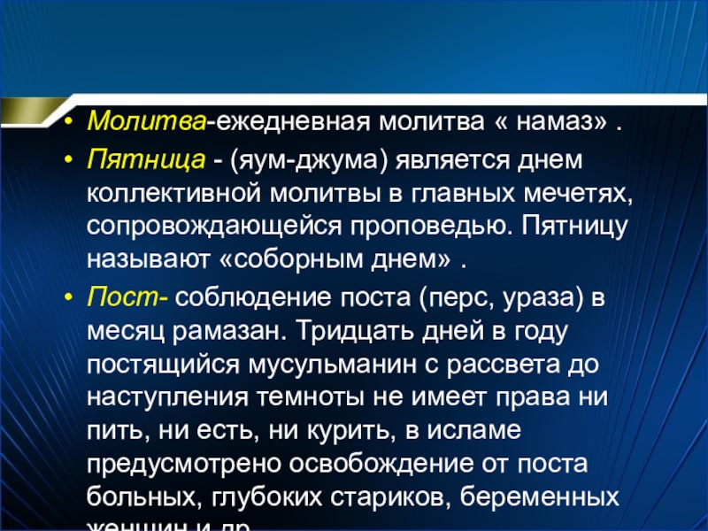 Пост- соблюдение поста (перс, ураза) в месяц рамазан. Тридцать дней в году постящийся мусульманин с рассвета до наступления темноты не имеет права ни пить, ни есть, ни курить, в исламе предусмотрено освобождение от поста больных, глубоких стариков, беременных женщин и др.
