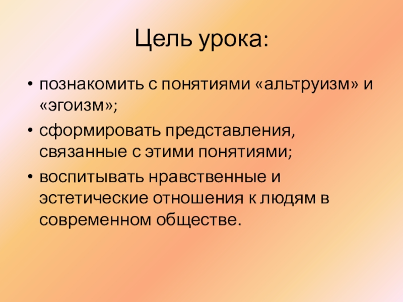 Цель урока:познакомить с понятиями «альтруизм» и «эгоизм»;сформировать представления, связанные с этими понятиями;воспитывать нравственные и эстетические отношения к людям в современном обществе.