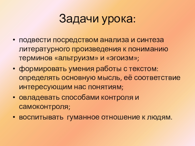 Задачи урока:подвести посредством анализа и синтеза литературного произведения к пониманию терминов «альтруизм» и «эгоизм»;формировать умения работы с