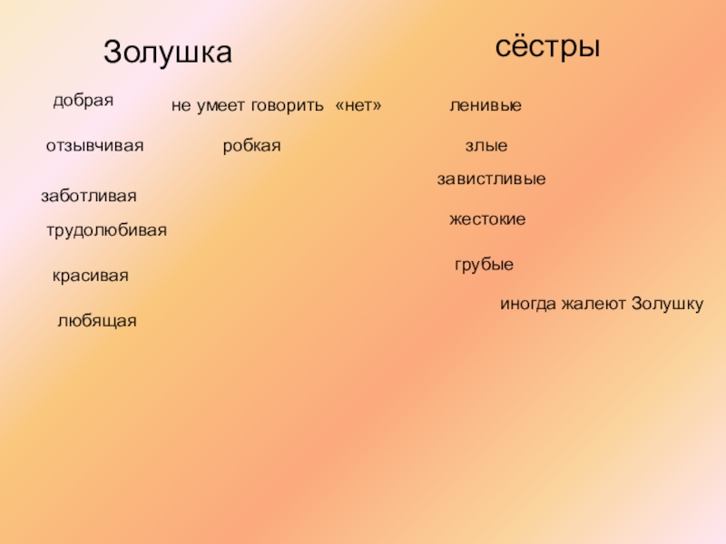 Золушкасёстрыдобраяотзывчиваязаботливаятрудолюбиваялюбящаякрасиваязлыеленивыезавистливыежестокиегрубыеробкаяне умеет говорить «нет»иногда жалеют Золушку