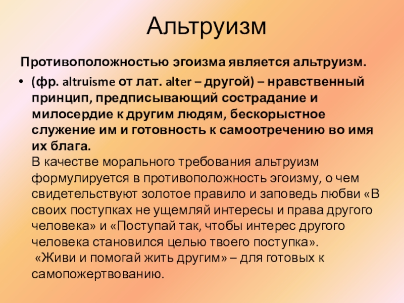 Альтруизм Противоположностью эгоизма является альтруизм.(фр. altruisme от лат. alter – другой) – нравственный принцип, предписывающий сострадание