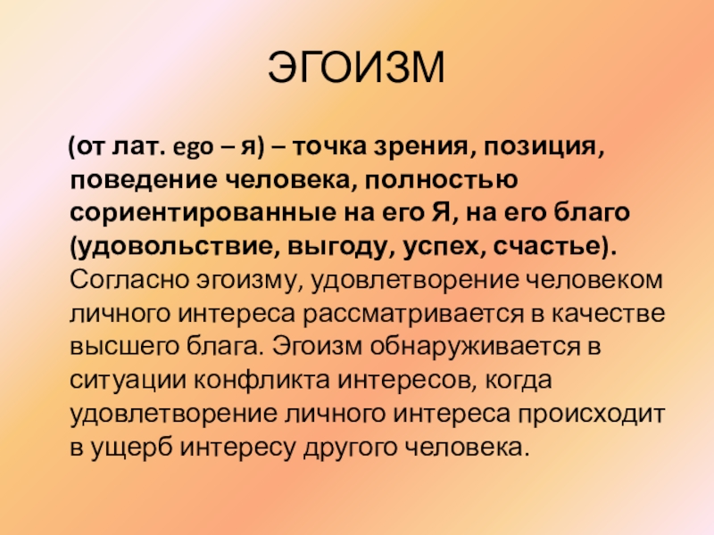 позиция, поведение человека, полностью сориентированные на его Я, на его благо (удовольствие, выгоду, успех, счастье). Согласно эгоизму, удовлетворение человеком личного интереса рассматривается в качестве высшего блага. Эгоизм обнаруживается в ситуации конфликта интересов, когда удовлетворение личного интереса происходит в ущерб интересу другого человека.