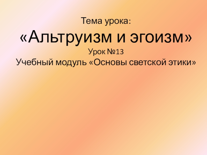 Слайд 1Тема урока: «Альтруизм и эгоизм» Урок №13 Учебный модуль «Основы светской этики»
