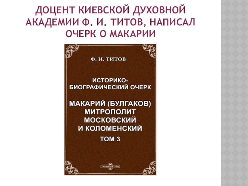 Слайд 5доцент Киевской духовной академии Ф. И. Титов, написал очерк о Макарии