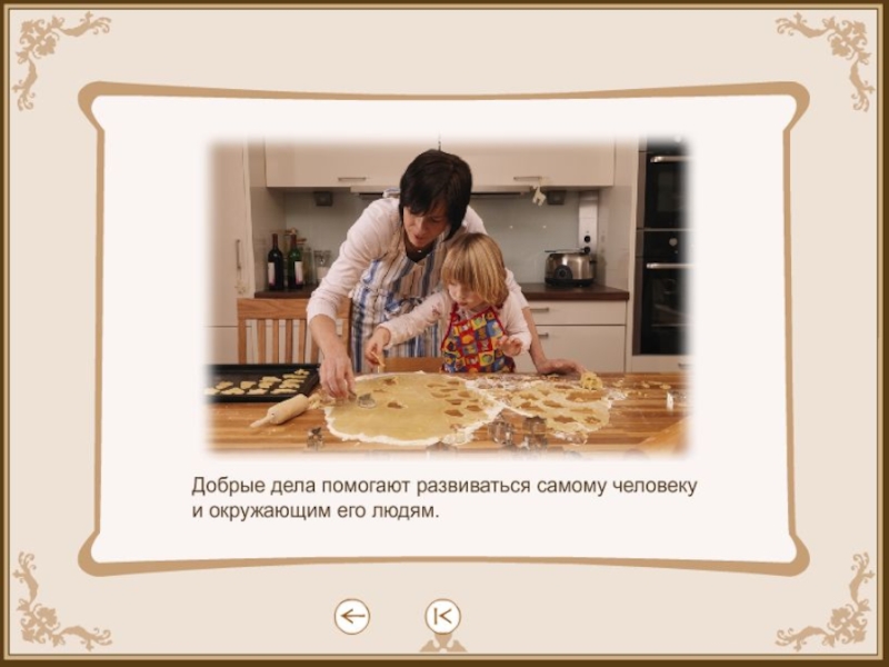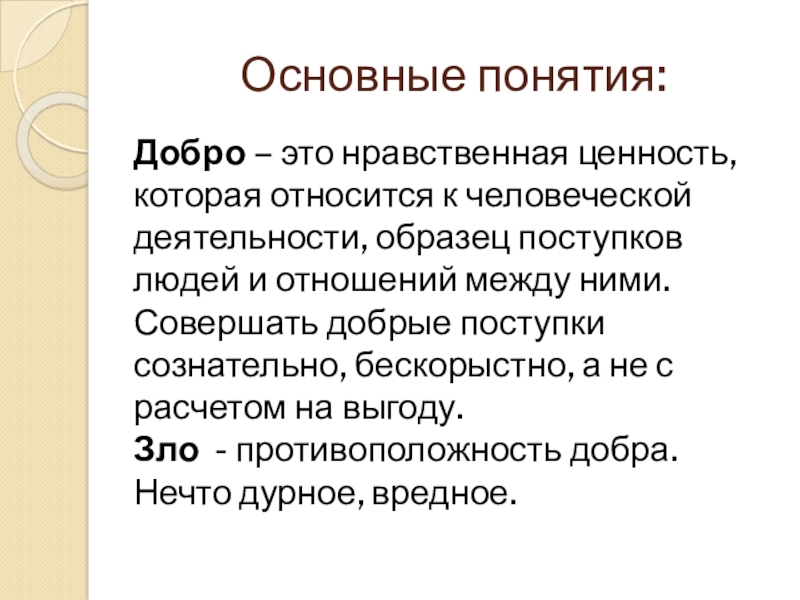 образец поступков людей и отношений между ними. Совершать добрые поступки сознательно, бескорыстно, а не с расчетом на выгоду.