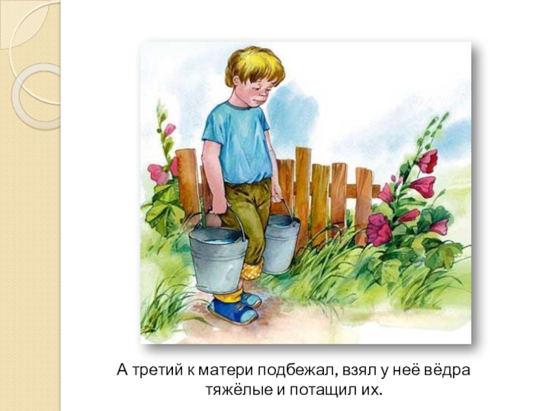 Слайд 19А третий к матери подбежал, взял у неё вёдра тяжёлые и