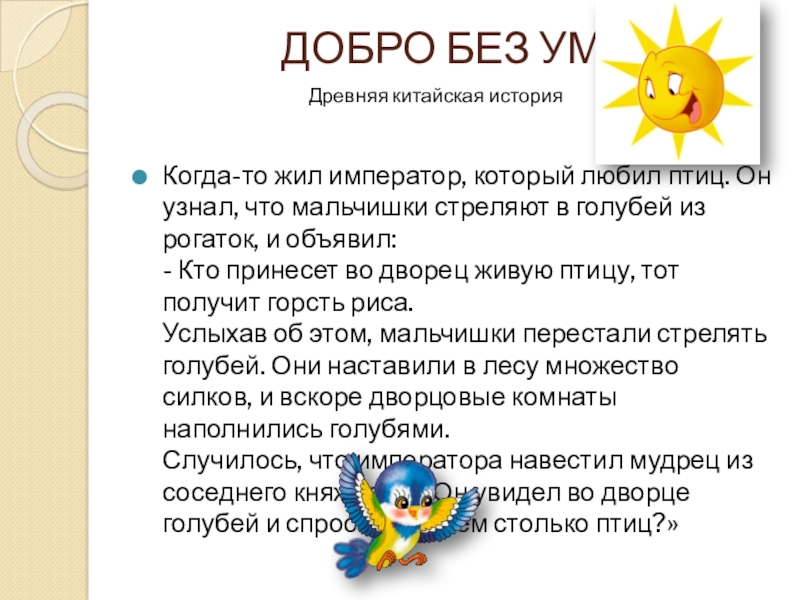 Случилось, что императора навестил мудрец из соседнего княжества. Он увидел во дворце голубей и спросил: «Зачем столько птиц?»