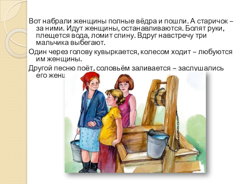 Слайд 18Вот набрали женщины полные вёдра и пошли. А старичок – за