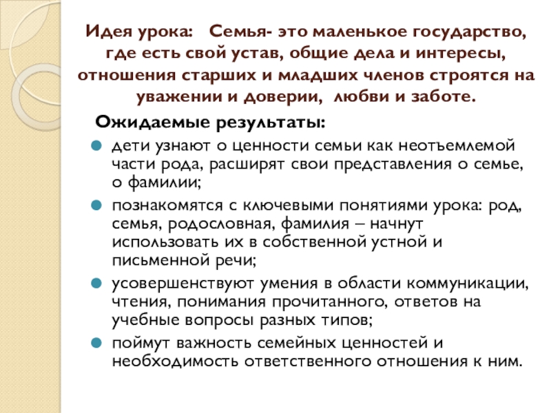 познакомятся с ключевыми понятиями урока: род, семья, родословная, фамилия – начнут использовать их в собственной устной и письменной речи;