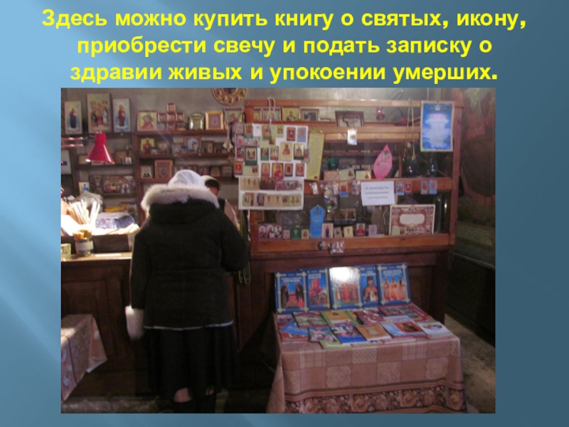 Слайд 60Здесь можно купить книгу о святых, икону, приобрести свечу и подать