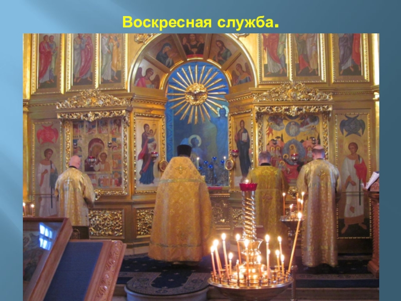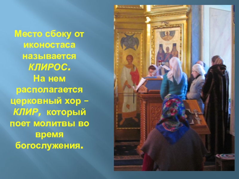 Слайд 77Место сбоку от иконостаса называется КЛИРОС.
