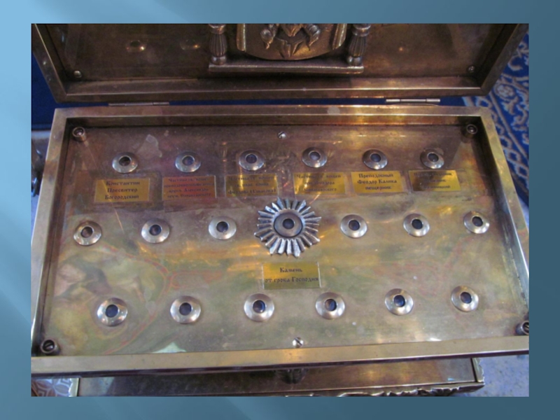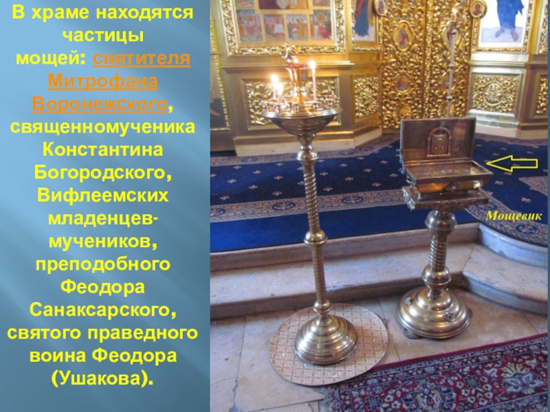 Слайд 49В храме находятся частицы мощей: святителя Митрофана Воронежского, священномученика Константина Богородского, Вифлеемских