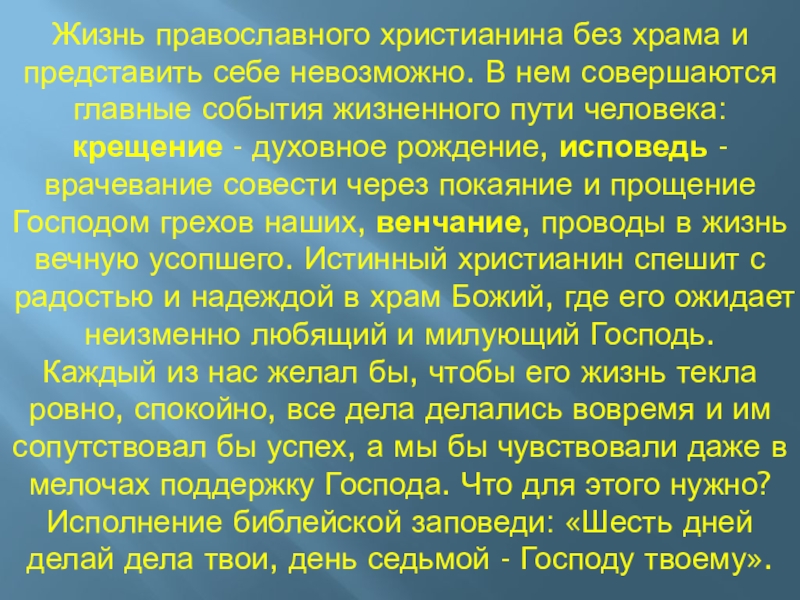 Слайд 80Жизнь православного христианина без храма и представить себе невозможно. В нем