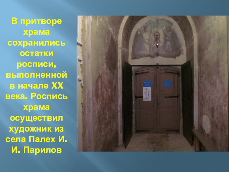 Слайд 34В притворе храма сохранились остатки росписи, выполненной в начале XX века.