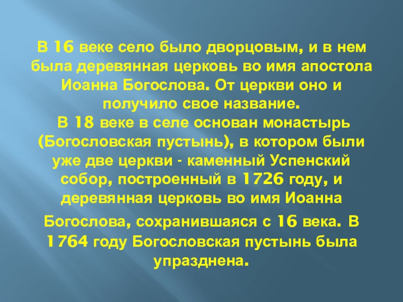 В 18 веке в селе основан монастырь (Богословская пустынь), в котором были уже две церкви - каменный Успенский собор, построенный в 1726 году, и деревянная церковь во имя Иоанна Богослова, сохранившаяся с 16 века. В 1764 году Богословская пустынь была упразднена.
