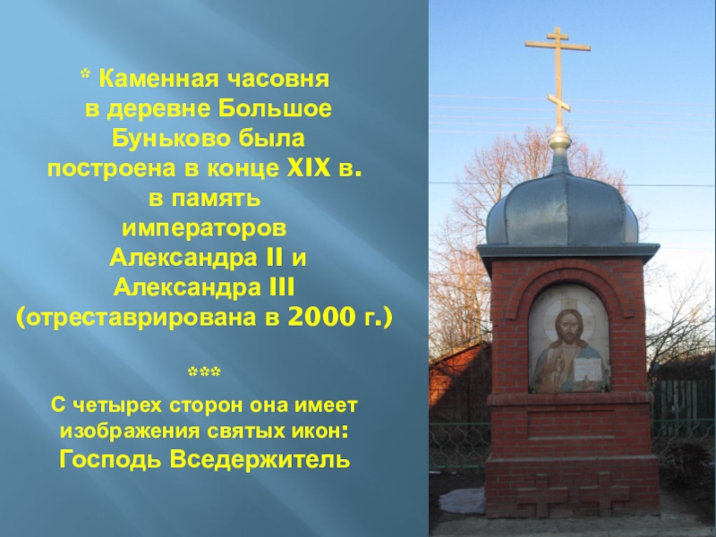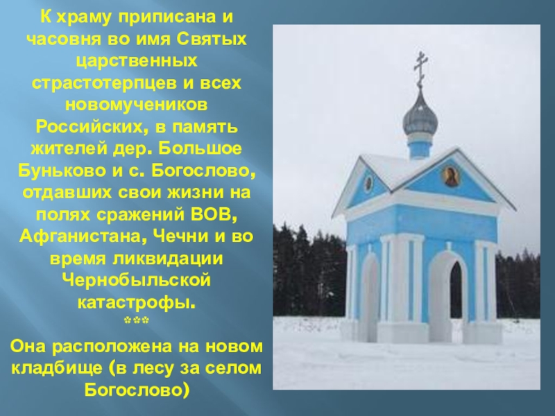 всех новомучеников Российских, в память жителей дер. Большое Буньково и с. Богослово, отдавших свои жизни на полях сражений ВОВ, Афганистана, Чечни и во время ликвидации Чернобыльской катастрофы.