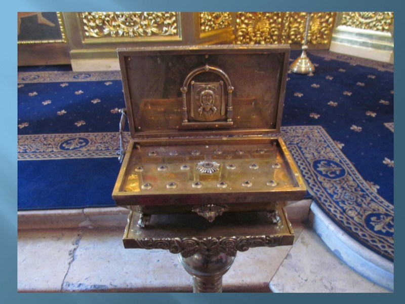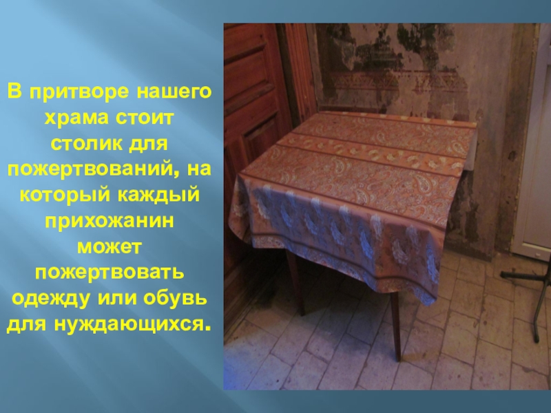 Слайд 33В притворе нашего храма стоит столик для пожертвований, на который каждый