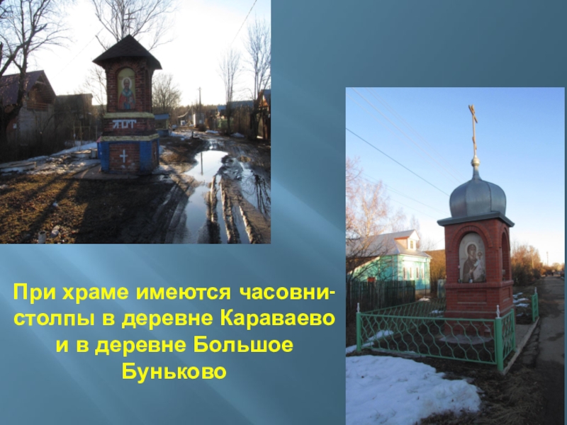 Слайд 17При храме имеются часовни-столпы в деревне Караваево и в деревне Большое
