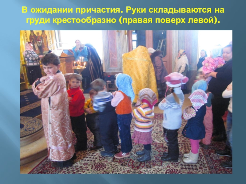 Слайд 43В ожидании причастия. Руки складываются на груди крестообразно (правая поверх левой).
