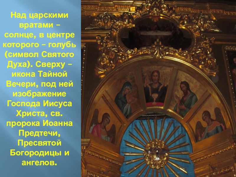 Слайд 73Над царскими вратами – солнце, в центре которого – голубь (символ