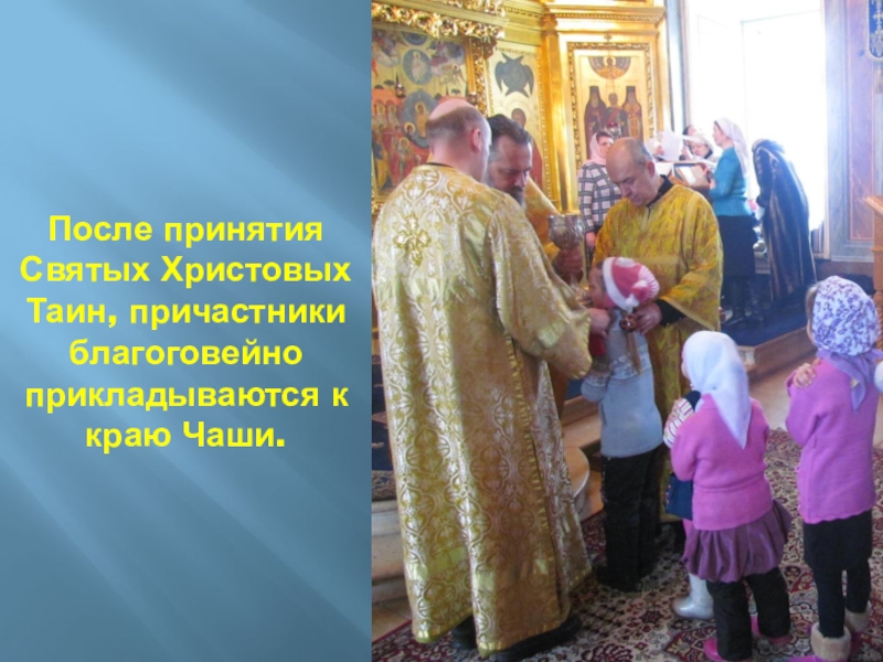 Слайд 45После принятия Святых Христовых Таин, причастники благоговейно прикладываются к краю Чаши.