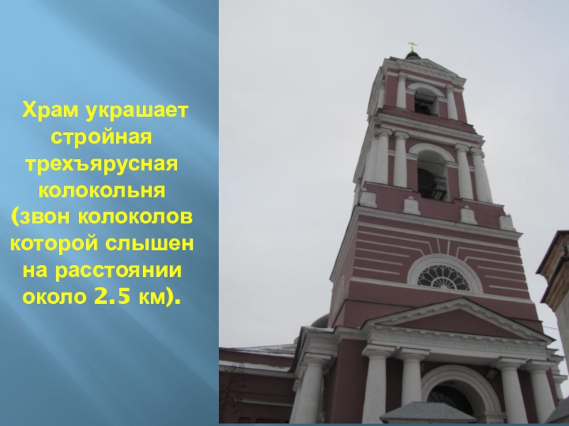 Слайд 30 Храм украшает стройная трехъярусная колокольня (звон колоколов которой слышен на