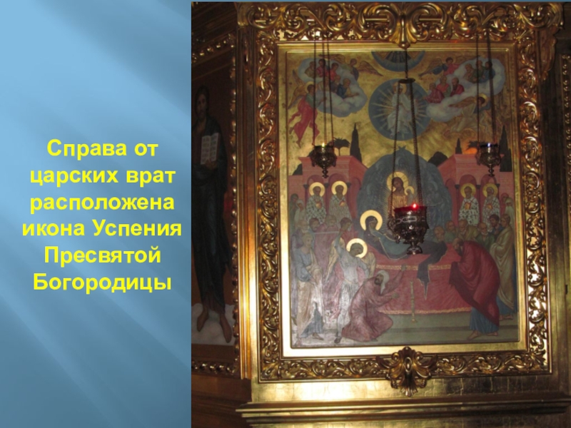 Слайд 71Справа от царских врат расположена икона Успения Пресвятой Богородицы