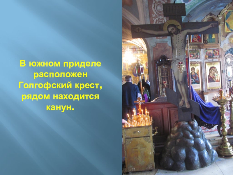 Слайд 56В южном приделе расположен Голгофский крест, рядом находится канун.