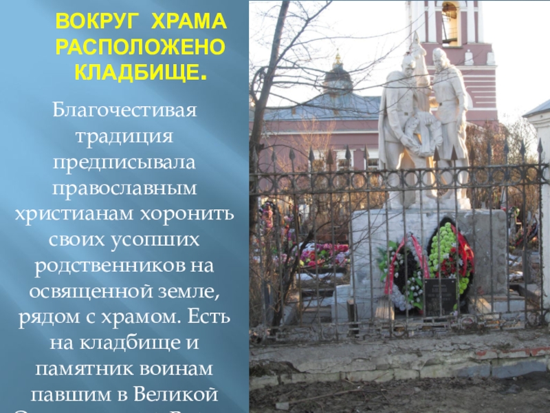 Слайд 28Вокруг храма расположено кладбище.