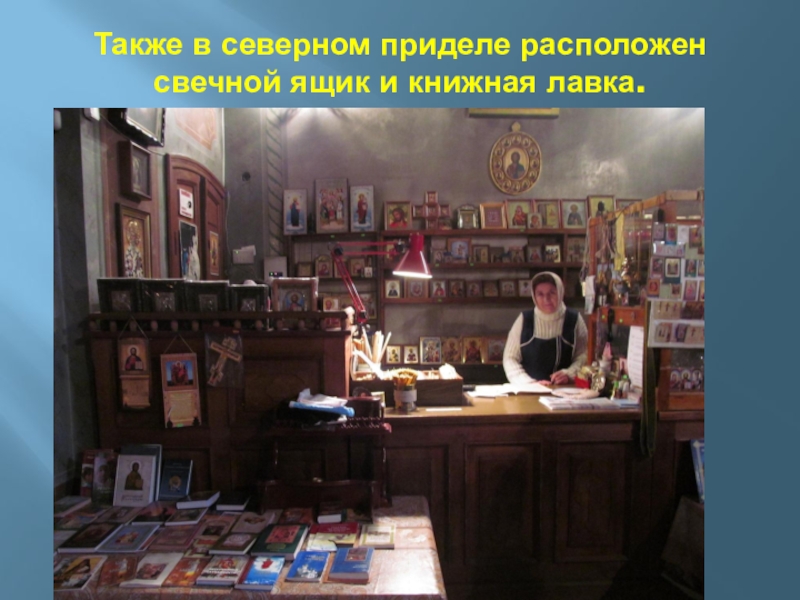 Слайд 59Также в северном приделе расположен свечной ящик и книжная лавка.
