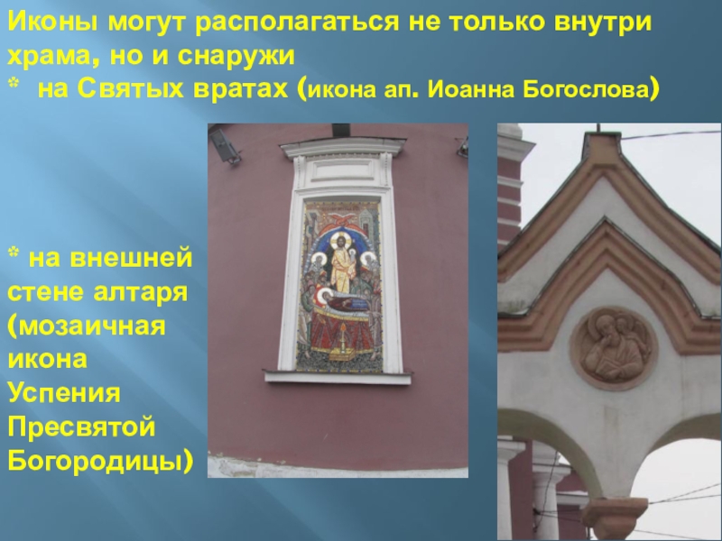 Слайд 64Иконы могут располагаться не только внутри храма, но и снаружи