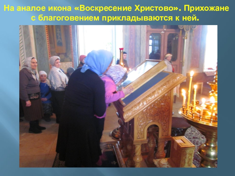 Слайд 39На аналое икона «Воскресение Христово». Прихожане с благоговением прикладываются к ней.