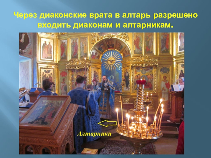 Слайд 76Через диаконские врата в алтарь разрешено входить диаконам и алтарникам.