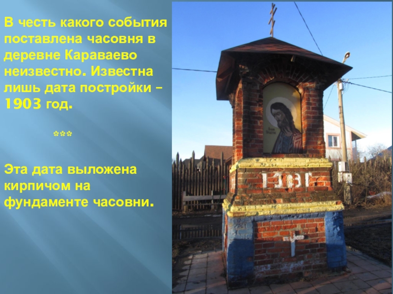 Слайд 21В честь какого события поставлена часовня в деревне Караваево неизвестно. Известна