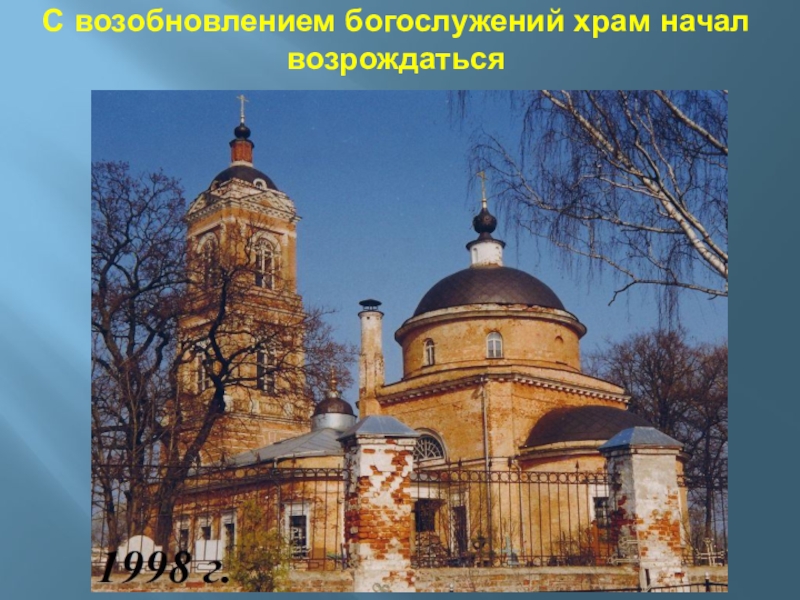Слайд 11Богослужения в храме возобновились лишь с 1990 года.