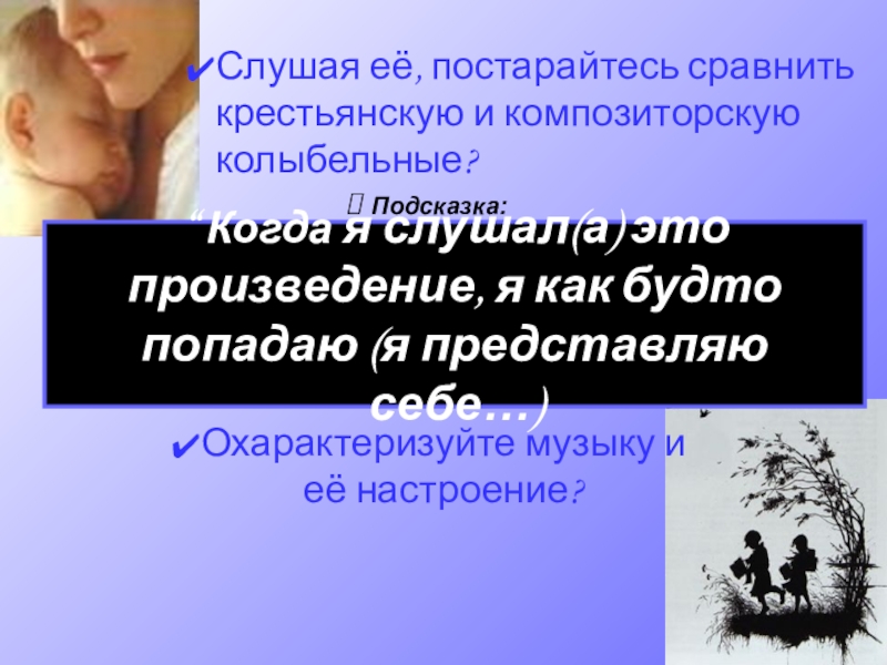 Слушая её, постарайтесь сравнить крестьянскую и композиторскую колыбельные?
