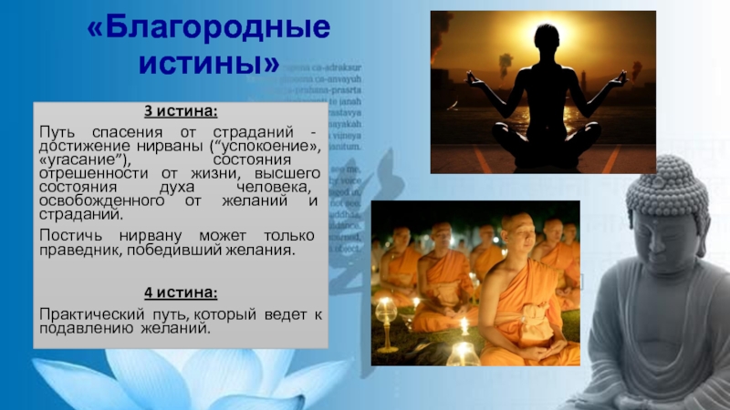 Путь спасения от страданий - достижение нирваны (“успокоение», «угасание”),