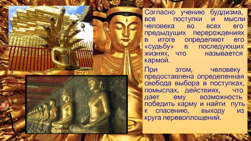 Слайд 8Согласно учению буддизма, все поступки и мысли человека во всех его
