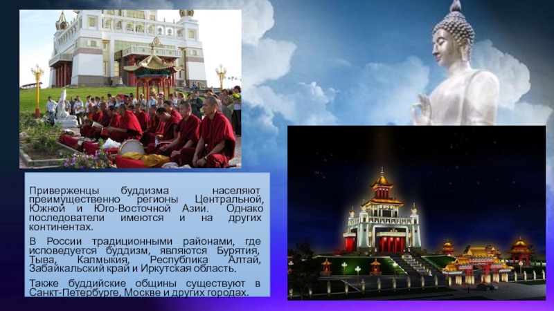 Приверженцы буддизма населяют преимущественно регионы Центральной, Южной и Юго-Восточной Азии.