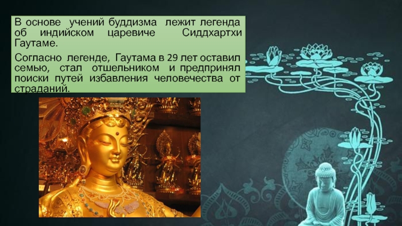 Слайд 3В основе учений буддизма лежит легенда об индийском царевиче Сиддхартхи Гаутаме.