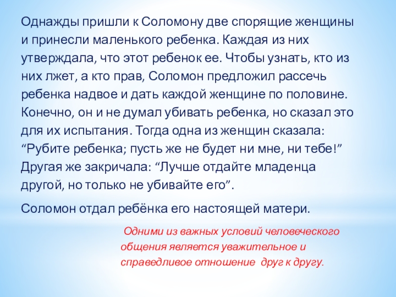 Одними из важных условий человеческого общения является уважительное и справедливое отношение друг к другу.