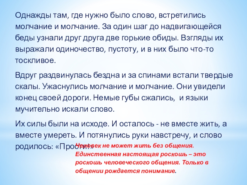 Человек не может жить без общения. Единственная настоящая роскошь – это роскошь человеческого общения. Только в общении рождается понимание.