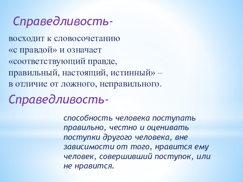 способность человека поступать правильно, честно и оценивать поступки другого человека, вне зависимости от того, нравится ему человек, совершивший поступок, или не нравится.