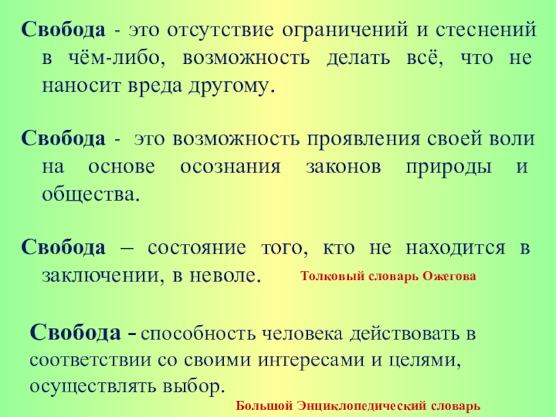 Свобода - способность человека действовать в соответствии со своими интересами и целями, осуществлять выбор.